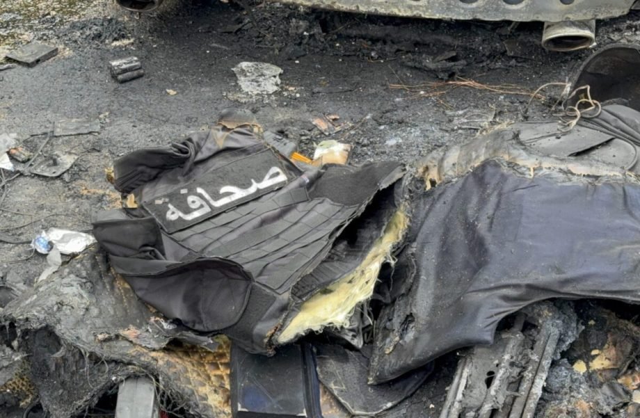 Burned press equipment and belongings are seen at the site of an Israeli airstrike in the Jezzine district of southern Lebanon, where three journalists, including Ali Shuaib of Al Manar TV, Fatima Fetuni of Al Mayadeen and photojournalist Mohammed Fetuni, were killed after their vehicle was targeted, on March 28, 2026. [Ahmed Kaddoura – Anadolu Agency]