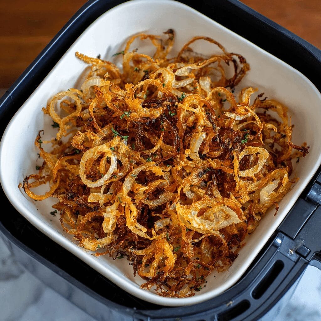 - Air fry – second stage: Lower the temperature to 240°F and continue cooking for 15–18 minutes, stirring every 5 minutes, until onions are golden brown and crispy.
