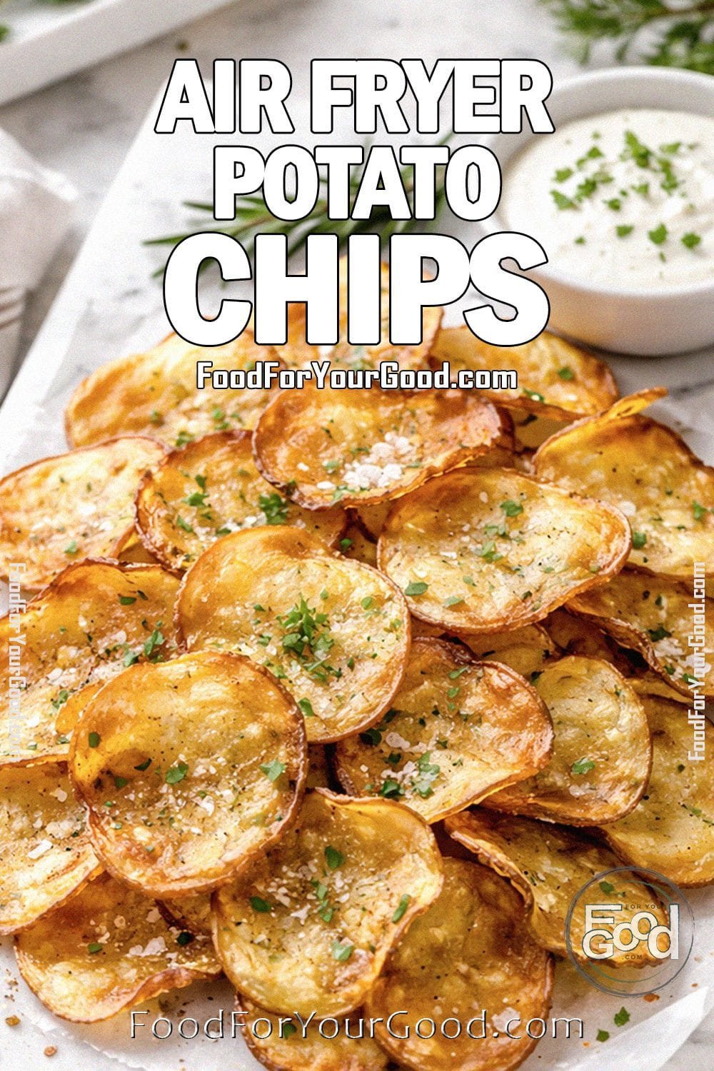 Air Fryer Potato Chips piled on a white marble tray with parchment paper, golden and crispy, garnished with herbs and served with ranch dressing.
