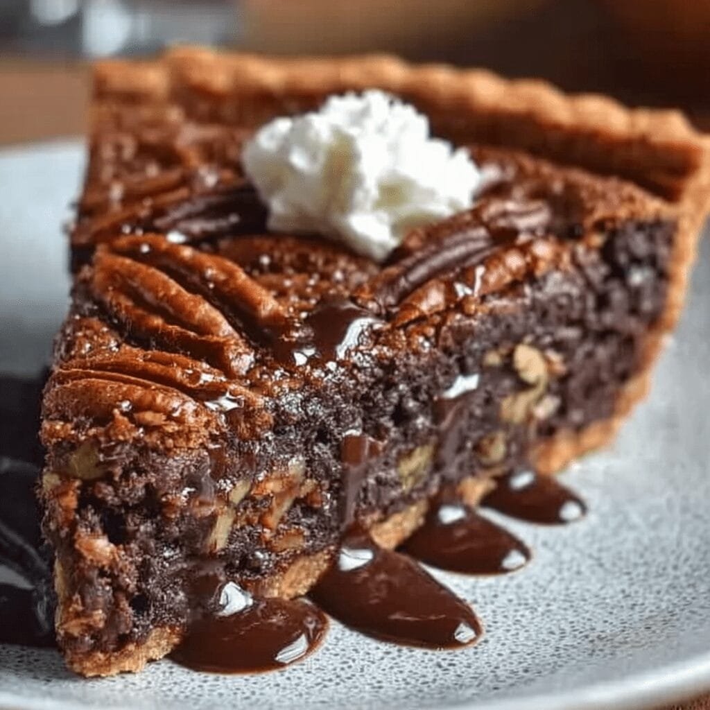 Every slice delivers layers of texture and flavor. The bottom is dense and chocolatey, the center is soft and gooey, and the top is crunchy with toasted pecans suspended in a sweet, buttery filling. The pie crust adds a crisp contrast that keeps the dessert from feeling overly rich. It’s indulgent, nutty, and deeply satisfying.
