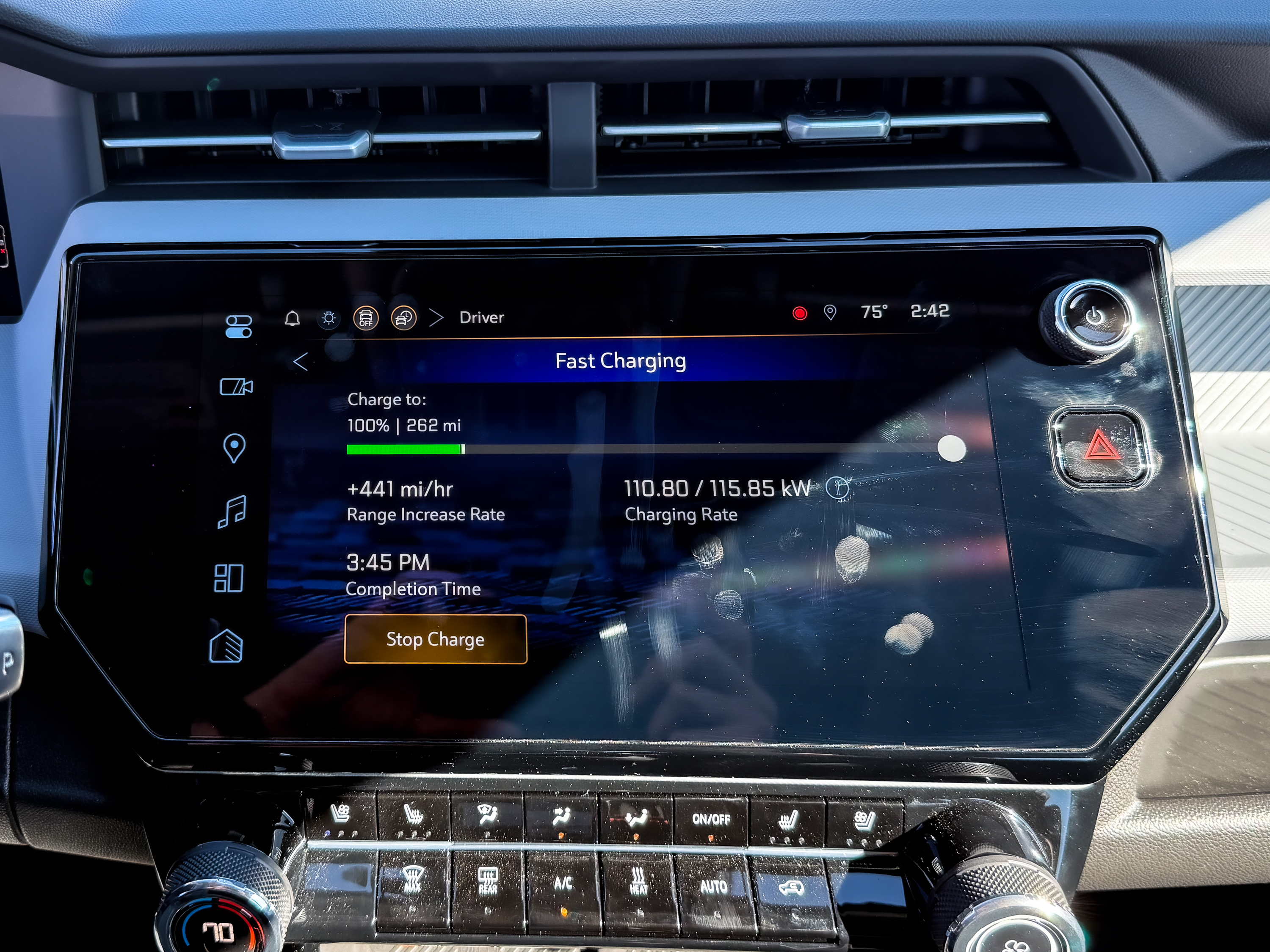 Perhaps the old Bolt’s biggest weakness was how slow its DC charging was—almost an hour to 80 percent at a maximum of just 55 kW. Now with NACS, things are a lot better. I tested recharging a Bolt LT from 19–80 percent using a Tesla V4 Supercharger, which took 25 minutes and added an indicated 211 miles of range. The charge curve is much flatter than before, starting at ~110 kW before gradually beginning to ramp down once the state of charge passed 65 percent. Like other batteries, the LFP pack will charge much more slowly once it reaches 80 percent, but unlike lithium-ion, you’re encouraged to charge the car to 100 percent as often as possible.