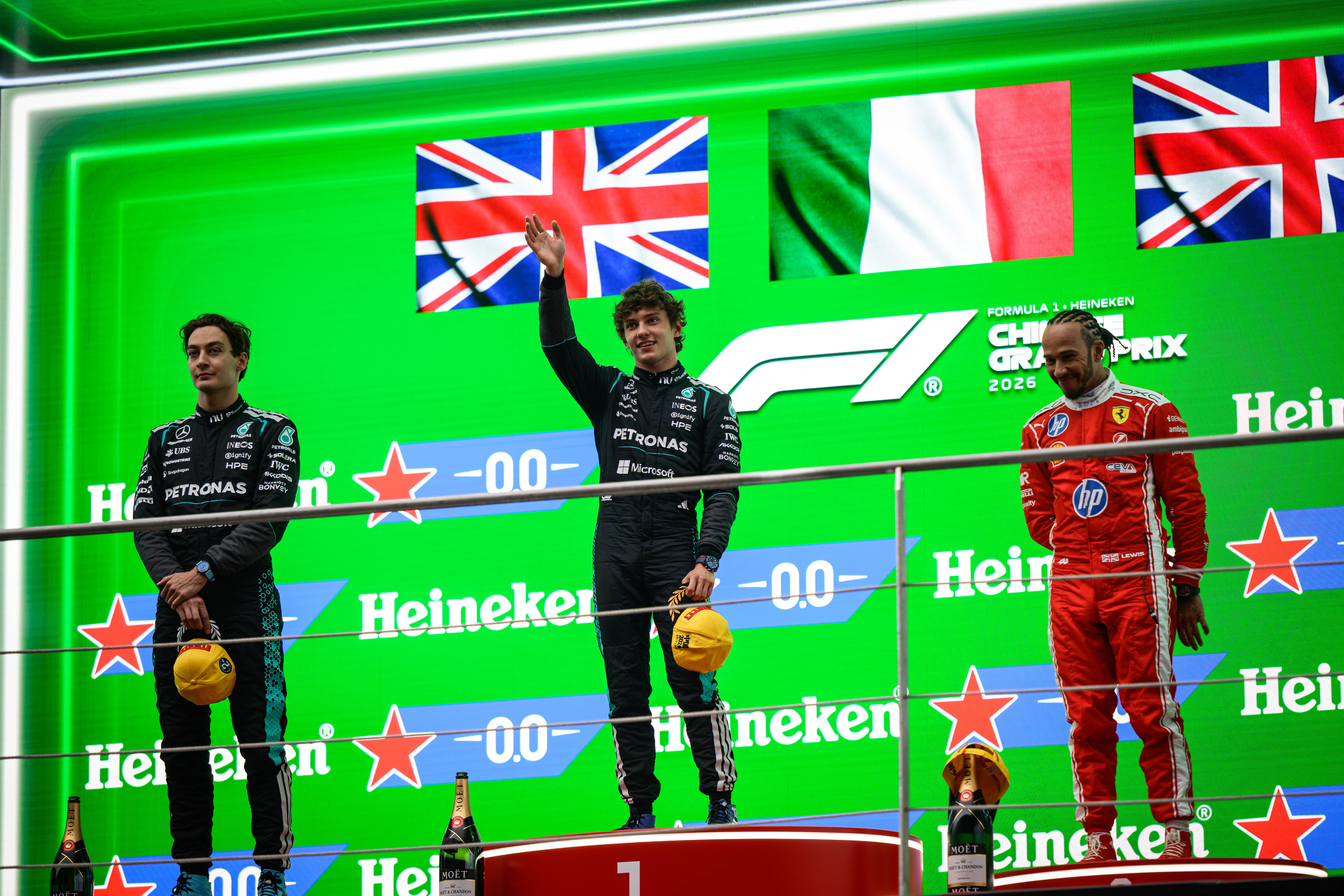 George Russell, Kimi Antonelli, and Lewis Hamilton on the podium after the Chinese Grand Prix. Credit: John Ricky/Anadolu via Getty Images