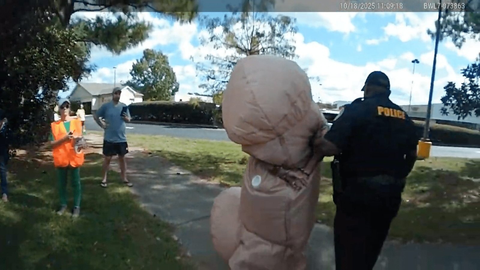 In the body camera footage, a police officer parks his black SUV on the grass, a rosary swinging from the rearview mirror. He exits his car, moves briskly past a pair of protesters, and points an accusatory finger at the suspect: a 7-foot-tall inflatable penis holding an American flag.