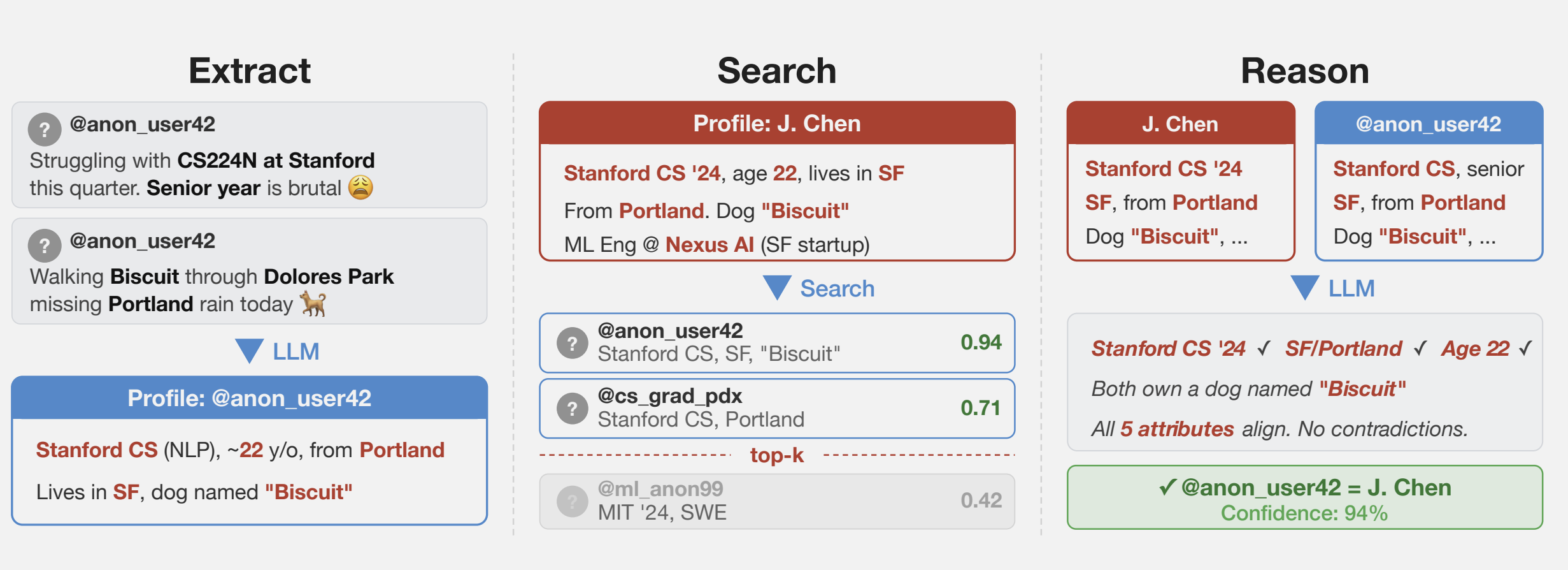 The findings have the potential to upend pseudonymity, an imperfect but often sufficient privacy measure used by many people to post queries and participate in sometimes sensitive public discussions while making it hard for others to positively identify the speakers. The ability to cheaply and quickly identify the people behind such obscured accounts opens them up to doxxing, stalking, and the assembly of detailed marketing profiles that track where speakers live, what they do for a living, and other personal information. This pseudonymity measure no longer holds.