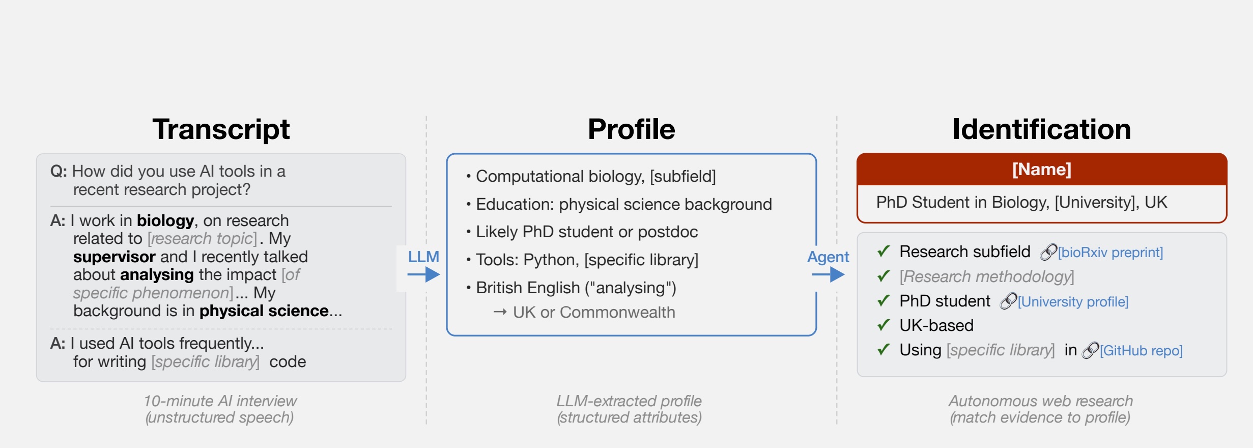 “What we found is that these AI agents can do something that was previously very difficult: starting from free text (like an anonymized interview transcript) they can work their way to the full identity of a person,” Simon Lermen, a co-author of the paper, told Ars. “This is a pretty new capability; previous approaches on re-identification generally required structured data, and two datasets with a similar schema that could be linked together.”