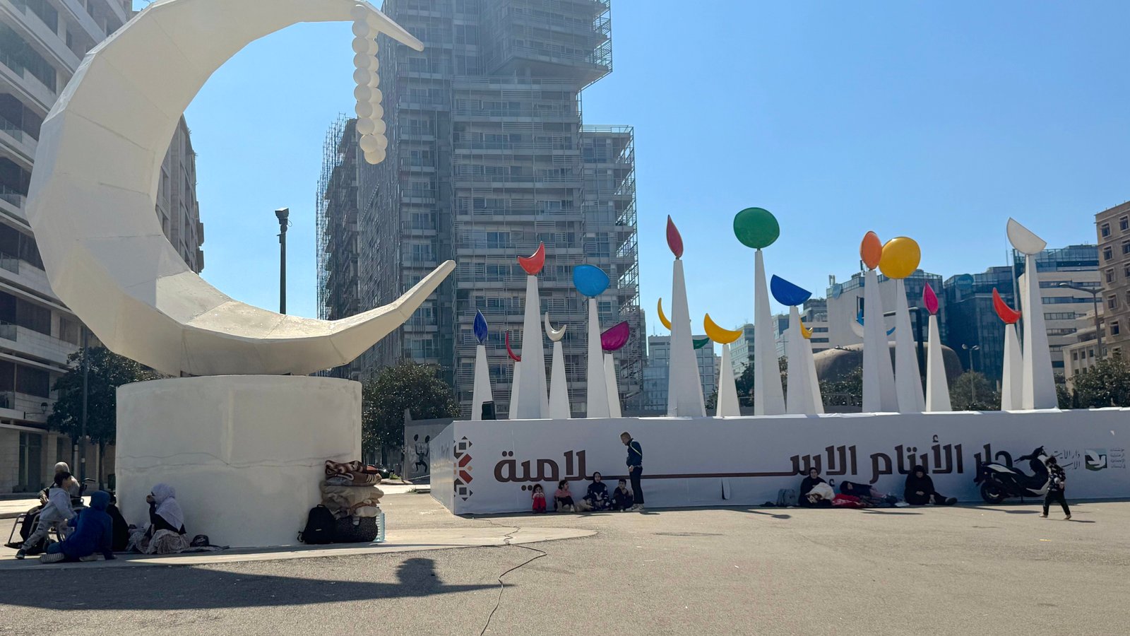 Authorities in Beirut have done nothing to help them, Fatima says. They are among a wide swath of the Lebanese populace that has been uprooted and one of tens of families who have found shelter near the gigantic crescent moon statue. A few men brought them blankets when they saw that the family was cold. The problem is that they have nowhere to go now. “Now we’re afraid to go back. They’re saying there’s bombing. So, we’re forced to be sitting here on the ground. What can we do? There’s no solution. There’s nothing,” she says.