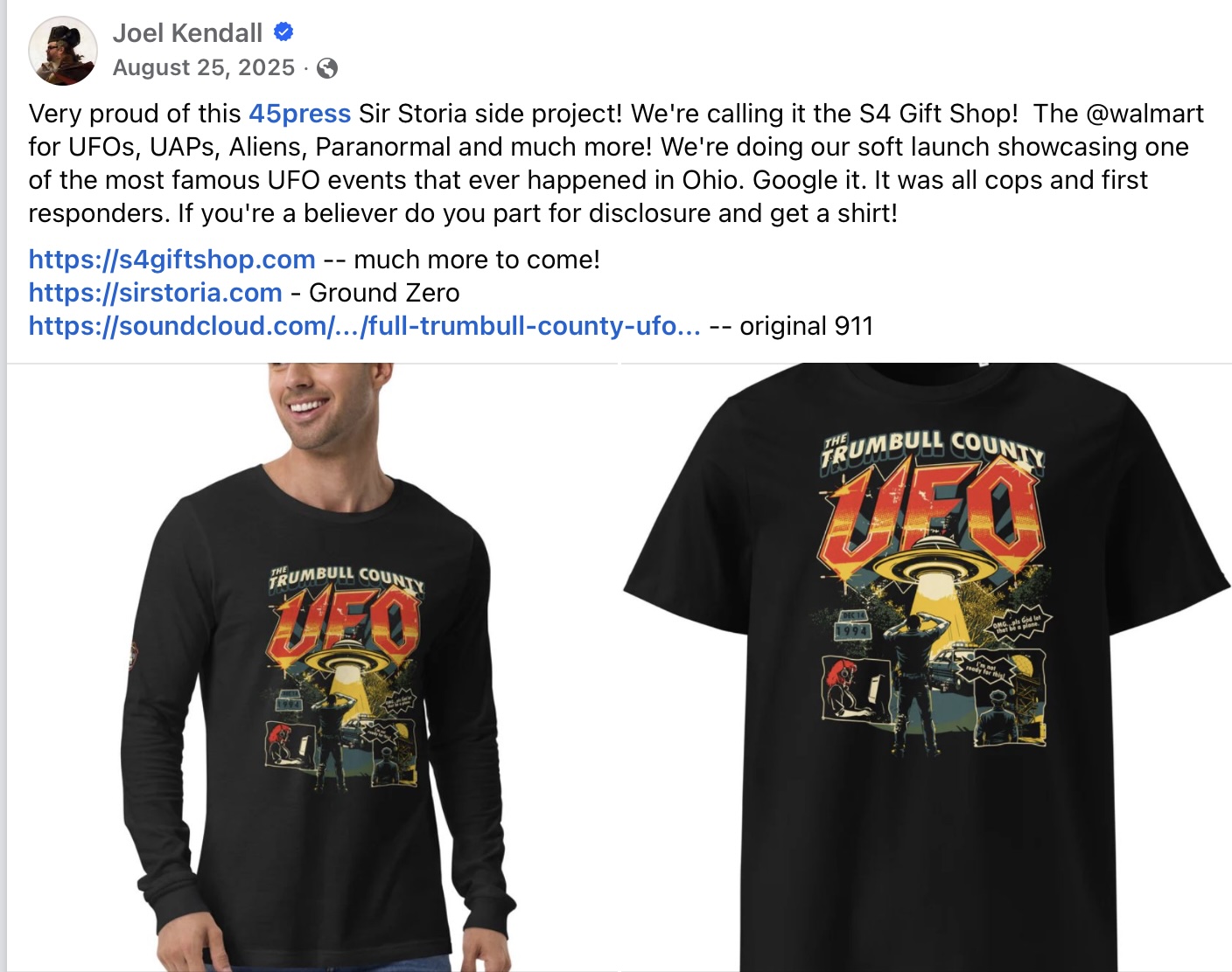In August 2025, Kendall created a (now-defunct) online store offering T-shirts for sale of what he called “the most famous UFO events that ever happened in Ohio.” In a Facebook post, Kendall said he hoped his shop would be “the @walmart for UFOs, UAPs, Aliens, Paranormal and much more!”