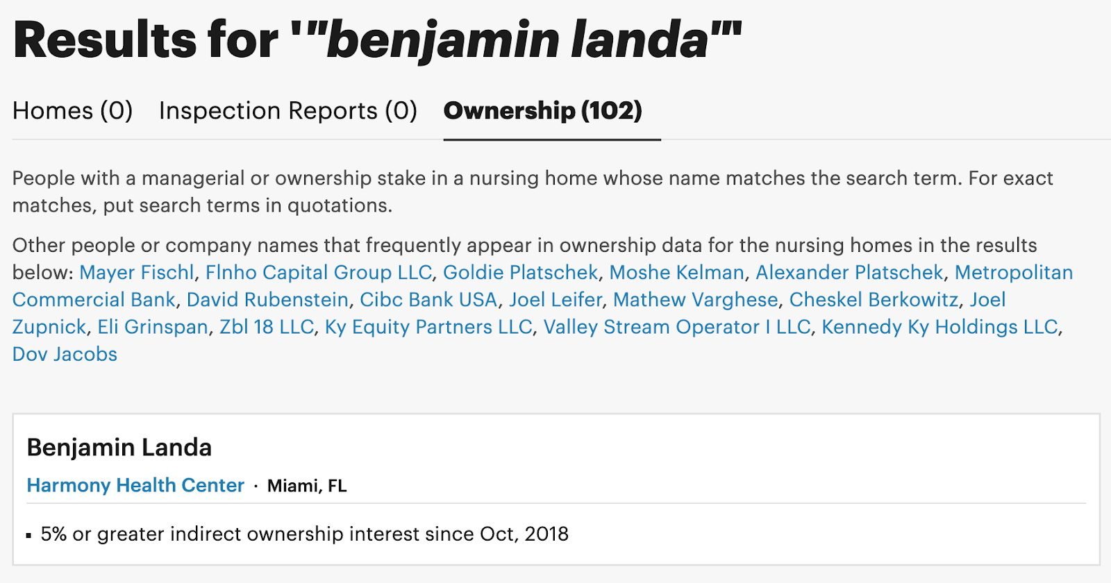 A screenshot from ProPublica’s Nursing Home Inspect database, showing results for a search for the name Benjamin Landa.