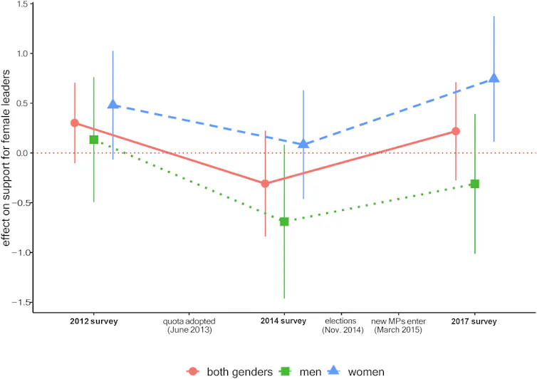 What this study does make clear is that quotas adopted voluntarily, without legal coercion, can change how ordinary citizens think about leadership.
