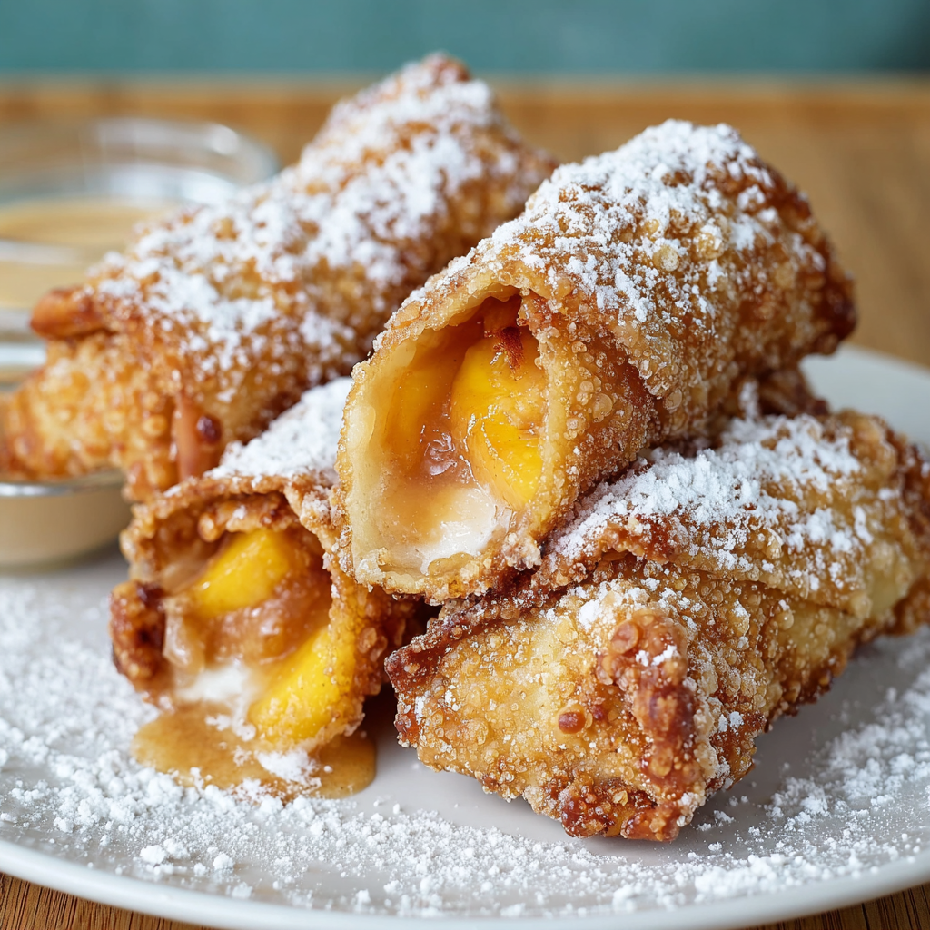 The peach filling is cooked first and allowed to cool. Once cooled, spoon the filling into egg roll wrappers, roll tightly, and seal with a bit of water. Fry in hot oil until deeply golden and crisp, then drain and cool slightly before serving.