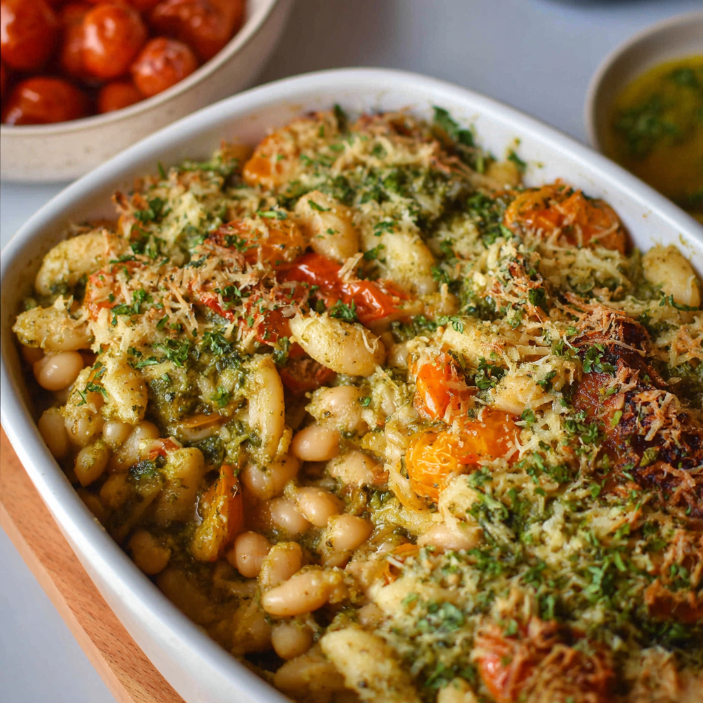 This White Bean & Pesto Bake proves that simple ingredients can create incredibly satisfying meals. With its creamy beans, herby pesto, tender rice, and crispy topping, it delivers comfort and flavor in every bite.
